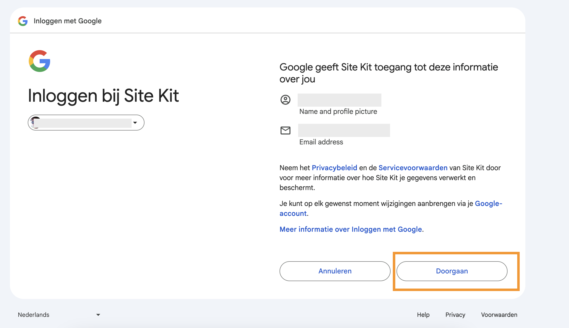 Om toegang te geven tot alle data in Google Analytics en Search Console moet je alle vinkjes aanzetten. Klik daarna onderaan op Doorgaan.