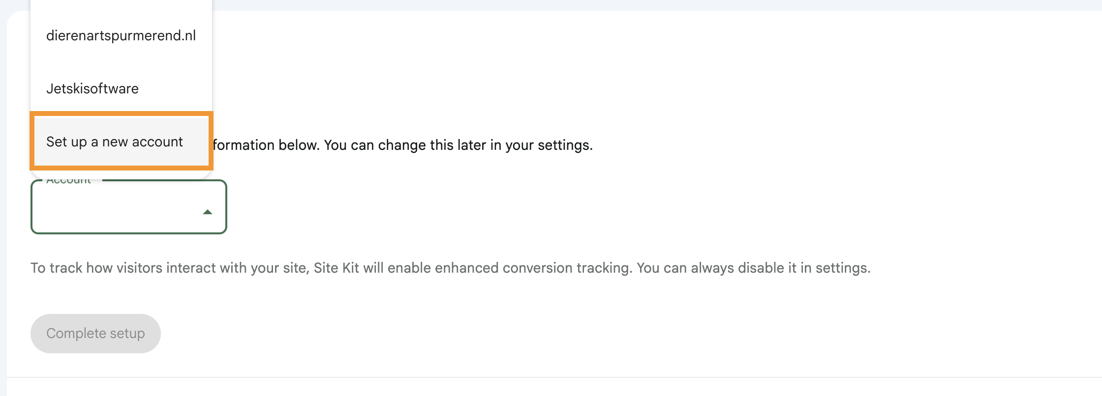 - Je komt nu weer terug in je Bloomsite. Als je nog geen Google Analytics account hebt, kom je op het volgende scherm. Vul hier eventueel een Account naam in en klik vervolgens op Create Account.