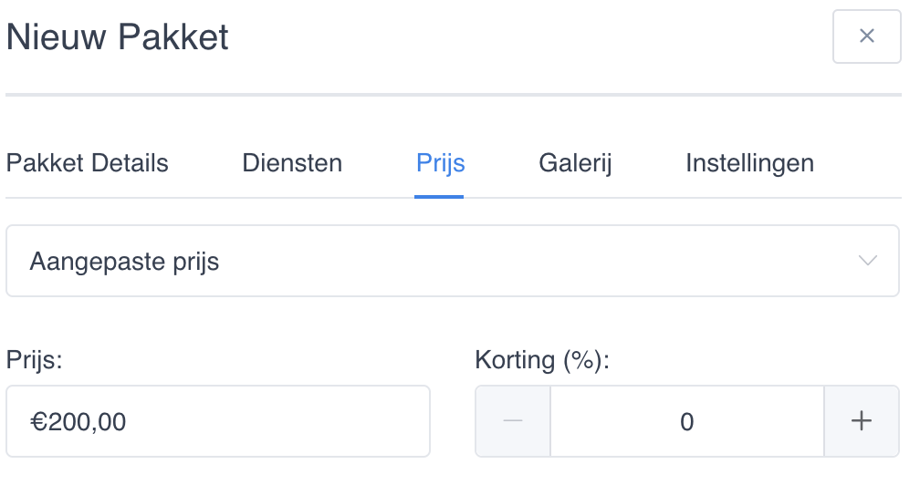 Tabje Prijs: N.a.v. de diensten die je toevoegt, wordt hier de prijs automatisch berekend. Je kunt echter ook een aangepaste prijs (bijvoorbeeld met voordeel) instellen.