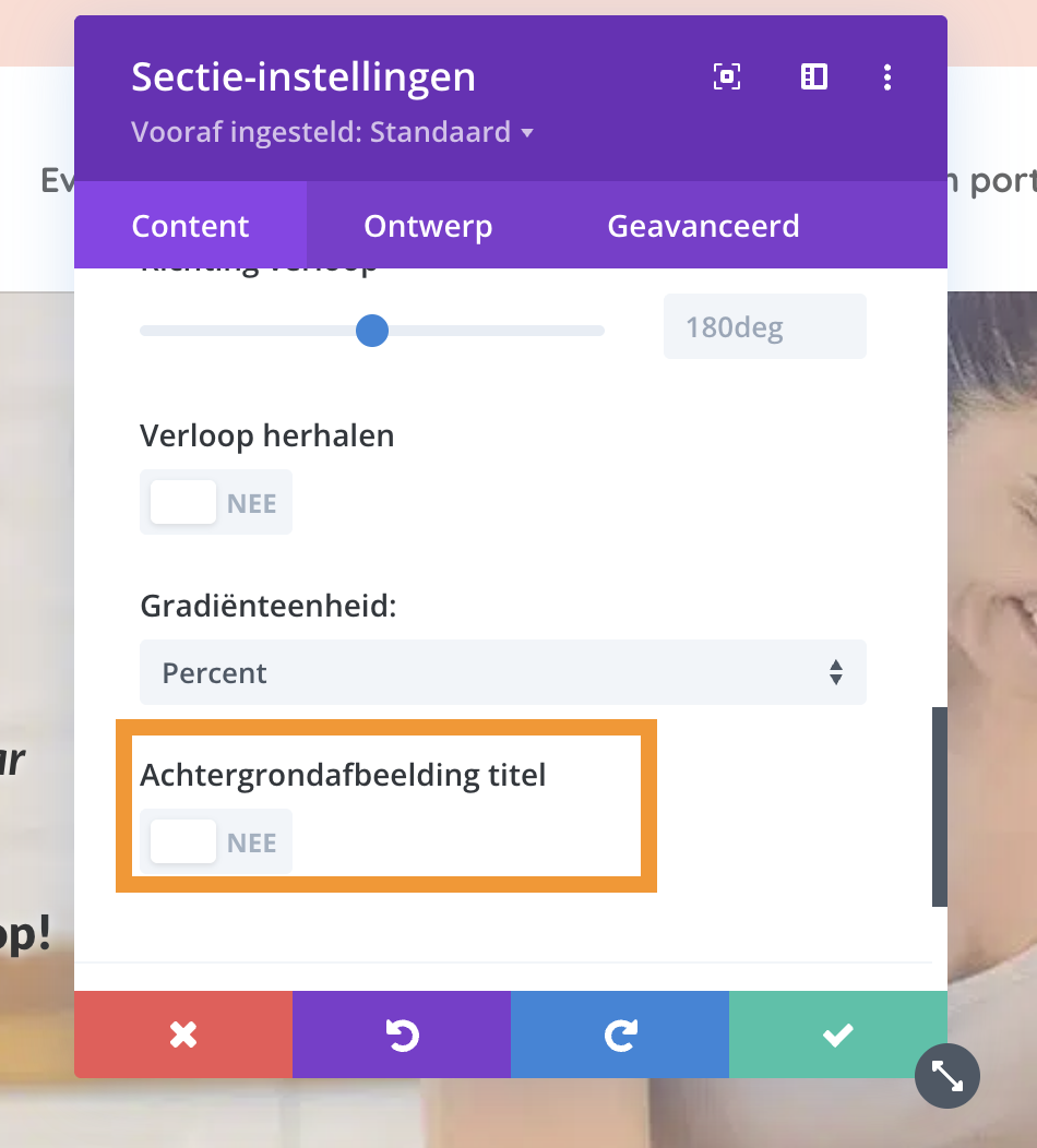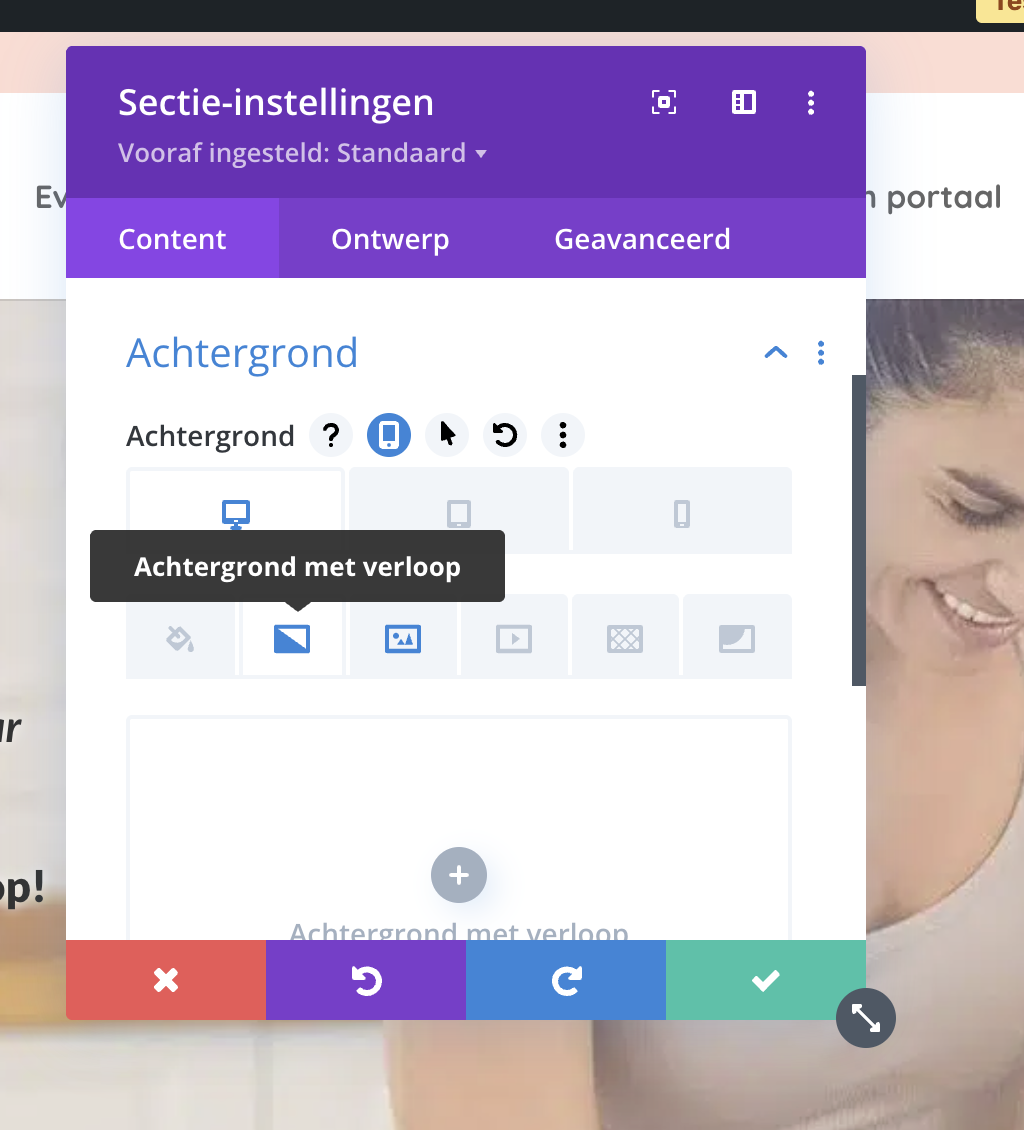 Wil je dat de verloop over de achtergrond wordt weergegeven (bijvoorbeeld handig als je een 'waas'/kleurovergang over een afbeelding wilt plaatsen, zorg dan dat deze functionaliteit ingeschakeld staat: