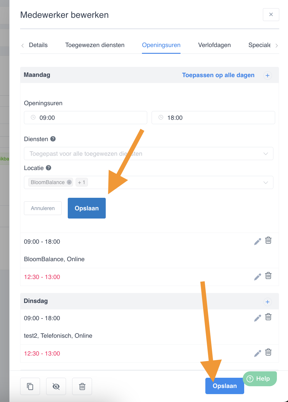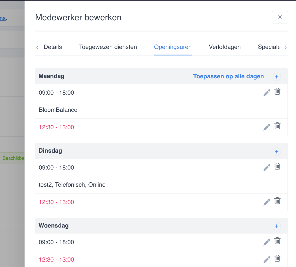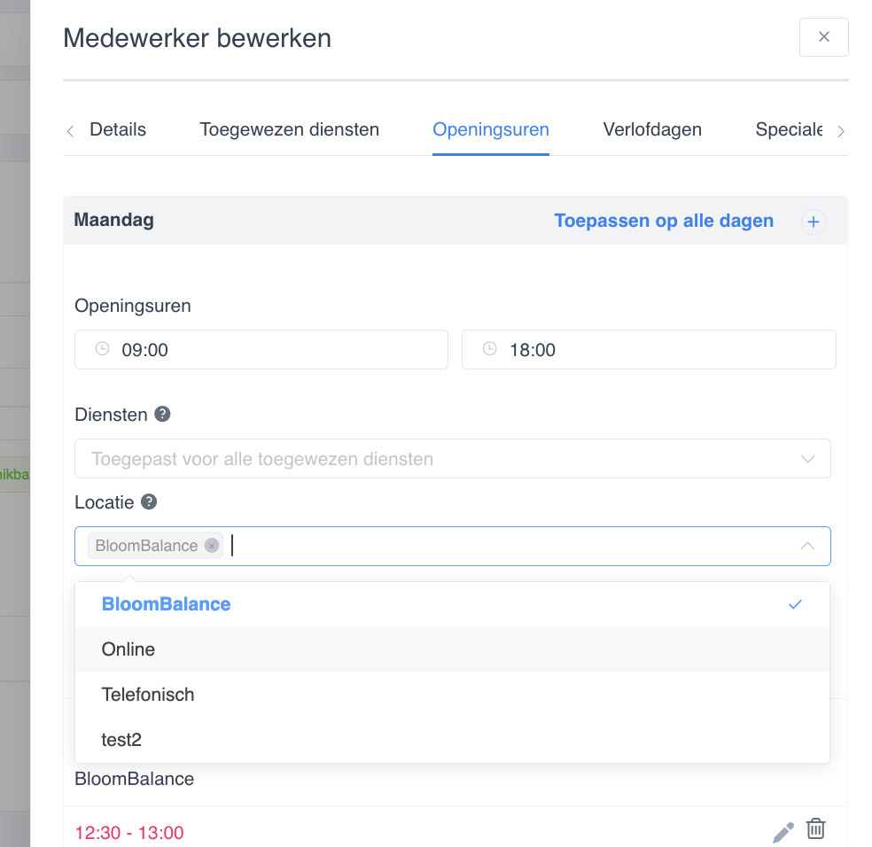 Om een medewerker op meerdere locaties beschikbaar te maken, kun je de openingstijden van de medewerker gebruiken: