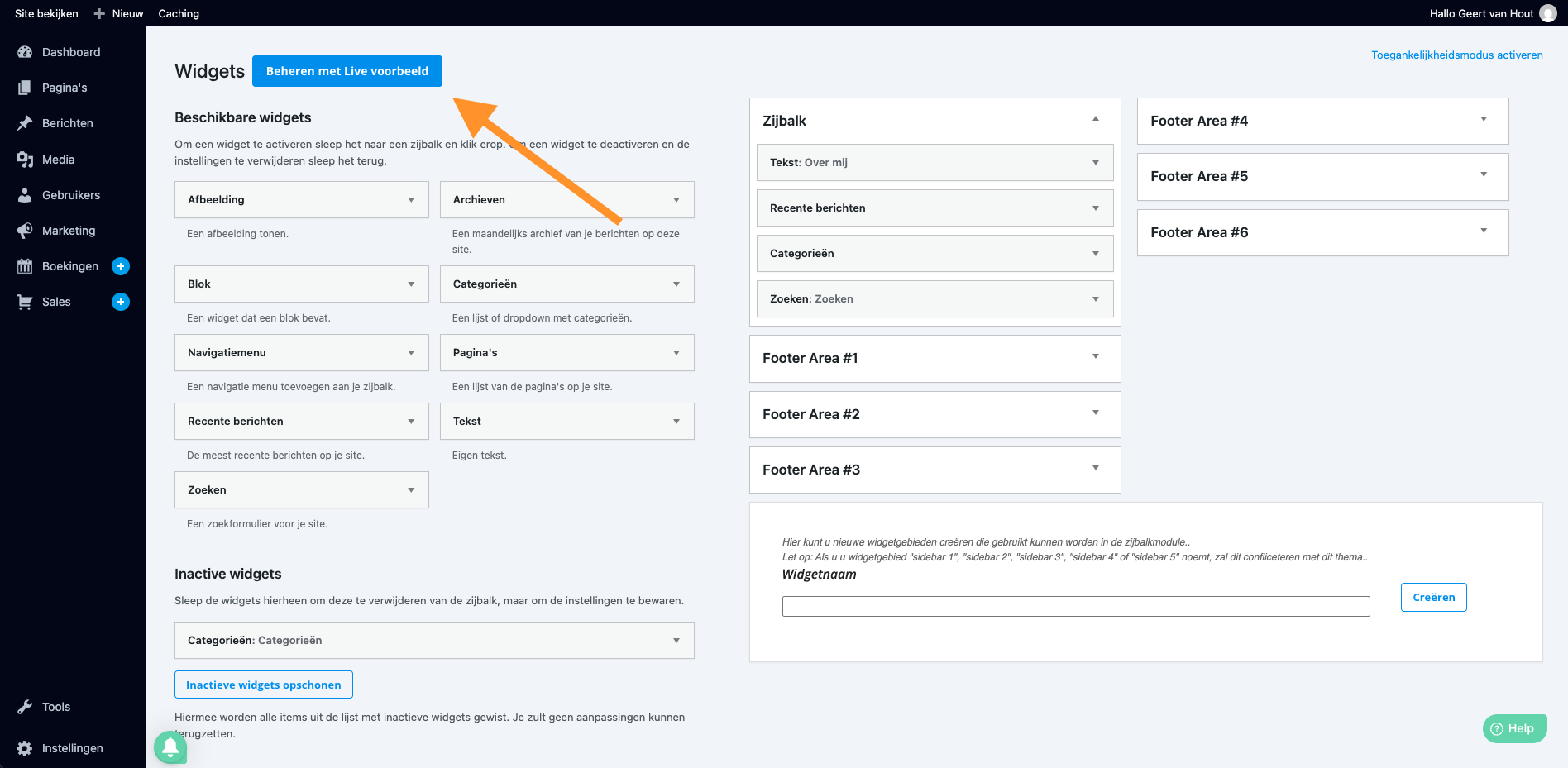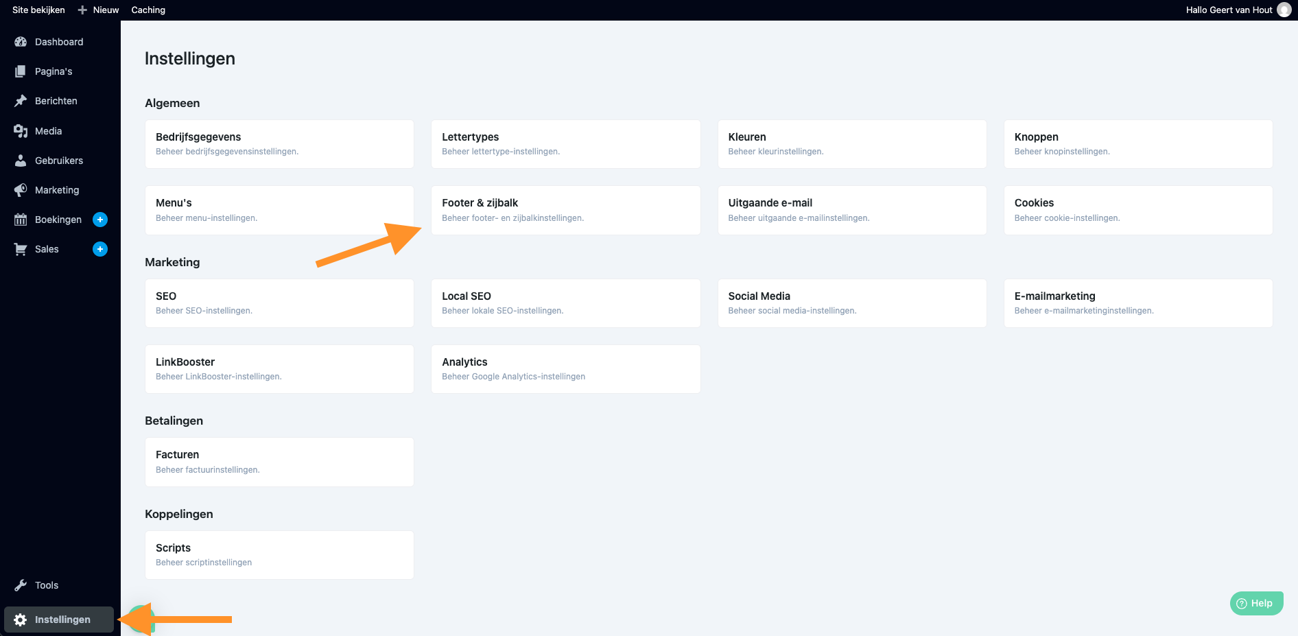 Log in op je website (jewebsite.nl/login) en ga naar "Instellingen" linksonderaan het dashboard menu van je website, en klik vervolgens op de "Footer & zijbalk" menu knop onder het kopje "Algemeen":