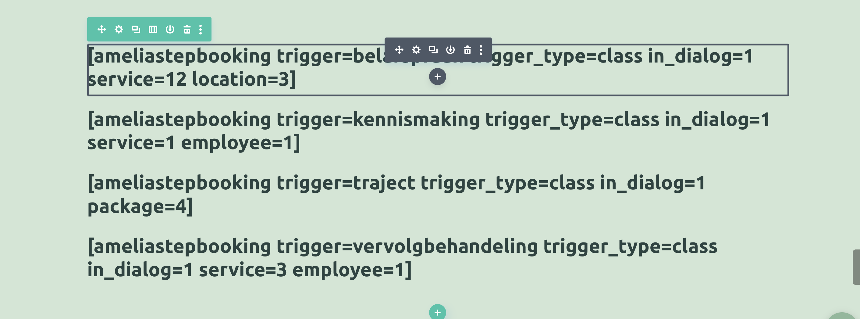 Ga naar de pagina waar de knoppen naar de boekingsformulier(en) staan. Scroll totdat je de shortcode tekst met "Amelia" ziet staan, zoals hieronder afgebeeld. Als er meerdere codes staan kan je deze individueel aanpassen. Klik op het tandwiel om het menu te openen.