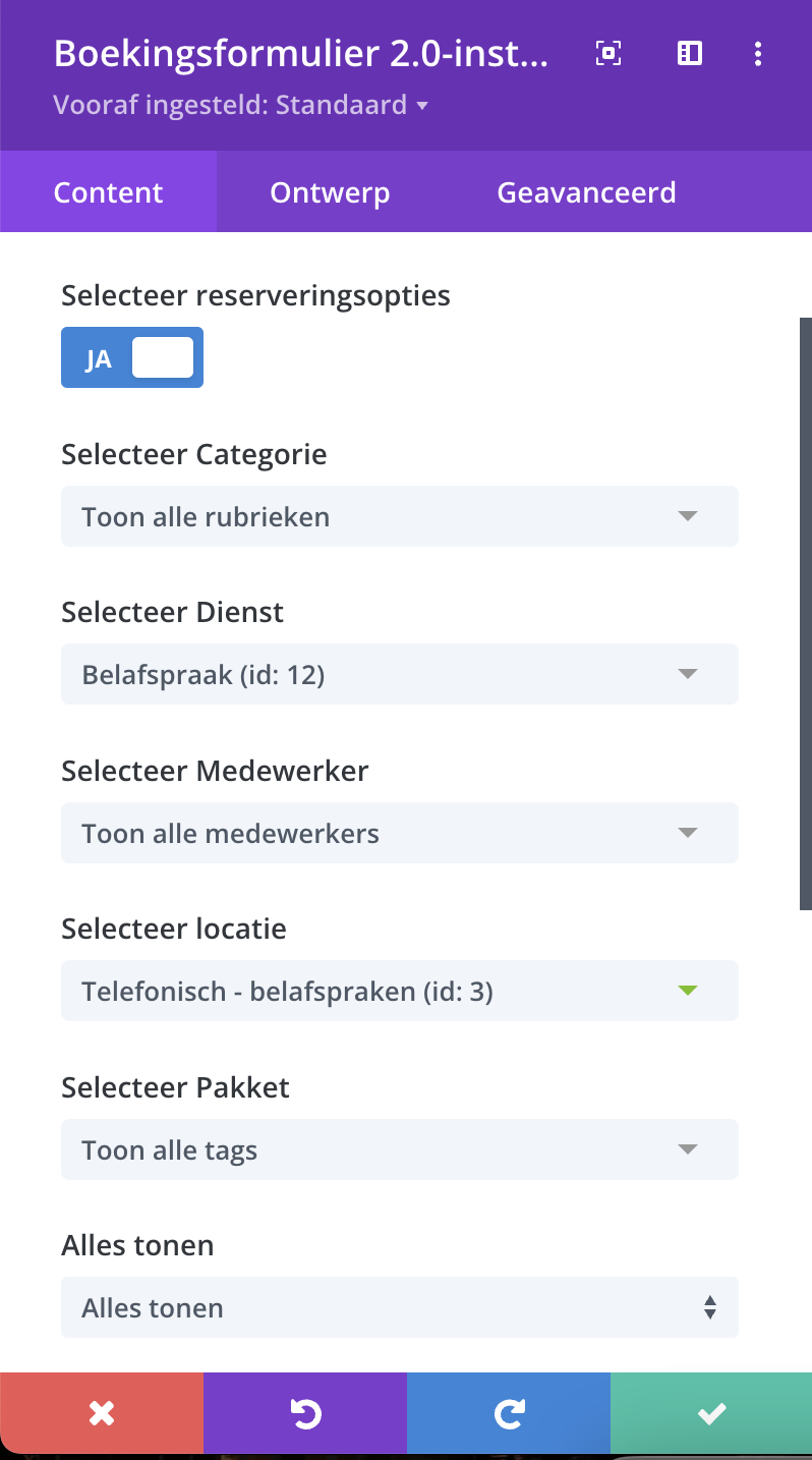 In het menu hieronder afgebeeld, zie ik de instellingen voor de knop voor de Belafspraak. Ik wil hier instellen dat de belafspraak alleen op de "locatie" Telefonisch geboekt kan worden, dus ik open het menu onder "Selecteer locatie" en vink hier alleen "Telefonisch" aan. Nu zal het boekingsformulier gelinked aan de knop voor het boeken van een Belafspraak automatisch alleen op de locatie "Telefonisch" geboekt kunnen worden.