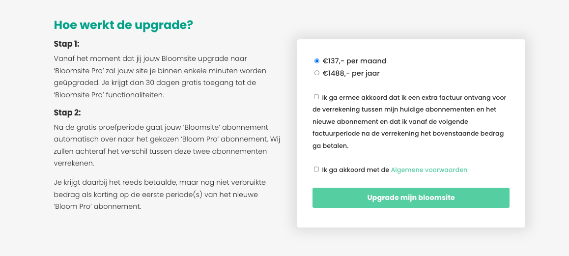 - Vervolgens controleer je het gekozen abonnement, gaat akkoord met de voorwaarden en klik op 'Upgrade mijn Bloomsite'